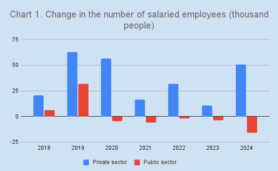 Moreover, contrary to the minister’s claims, neither in 2023 nor in the previous years did private-sector employees account for 50% of total salaried workers. That threshold was reached only in 2024, and even then, mainly because 15.9 thousand jobs were cut in the public sector.