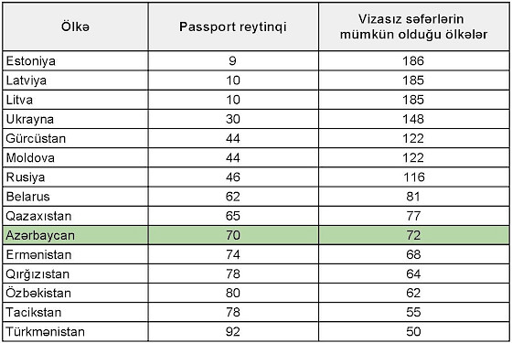 Cədvəl 1. Postsovet ölkələrinin pasport reytinqləri və vizasız səfər istiqamətlərinin sayı