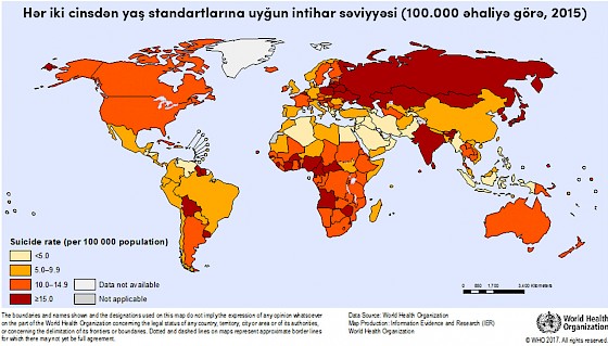 Hər il təxminən 800 min adam intihar səbəbiylə ölür və bu hər 40 saniyədə bir nəfər deməkdir. İntihar ömür boyu baş verə bilən bir şeydir və qlobal səviyyədə 15-29 yaş arasındakı insanların ölümünün ikinci aparıcı səbəbidir. İntihar qlobal bir fenomendir, amma 2015-ci ildə intiharların 78% -i aşağı və orta gəlirli ölkələrdə baş vermişdir.