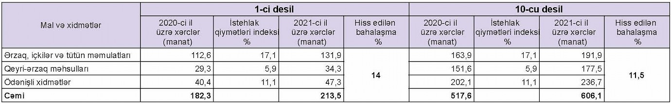Beləliklə, 1-ci desilə daxil olan vətəndaşlar bir il əvvəl istehlak etdikləri malları və xidmətləri almaq üçün 14% çox xərcləməli olduqları halda ən çox gəliri olan 10-cu desilə daxil olan vətəndaş 11.5% çox xərcləməlidir (5-ci desil üzrə müvafiq göstərici 13%-dir).