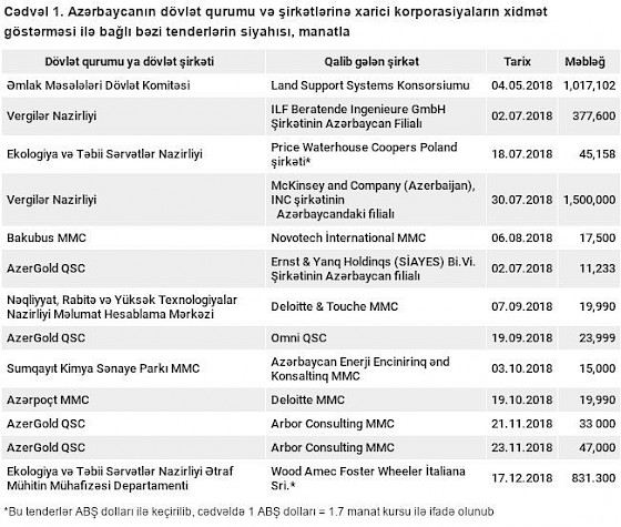 2015-ci il hadisələrindən sonra Azərbaycan dövlət qurumlarına xarici şirkətlərin məsləhət və ekspertiza xidmətləri artıb. 2018-ci ildə müxtəlif məsləhət və ekspertiza xidmətləri üzrə bir neçə tender keçirilib. Bu tenderlərdə ya xarici şirkətlərin yerli filialları, ya da birbaşa şirkətlərin özü qalib gəlib, ya da, məsələn, PricewaterhouseCoopersin (PwC) yerli filialı olmasına baxmayaraq, tenderi Polşa filialı udub.