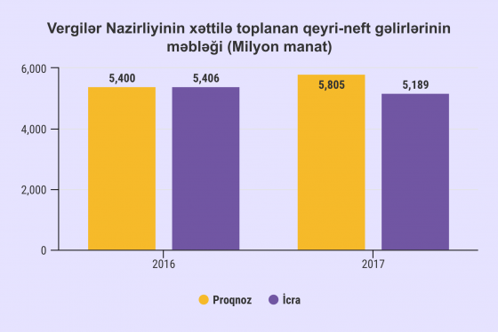 Təqdim edilən məlumatlardan aydın olur ki, il ərzində nazirlik qeyri-neft sektorundan 5 milyard 805 milyon manat vergi toplamalı olduğu halda, daxil olan faktiki vəsaitin həcmi 5 milyard 189 milyon manat olub.