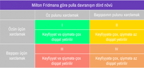 Fridmanın yanaşmasına görə, ictimai vəsaitləri xərcləyəndə pulla davranış IV kateqoriyaya uyğun gəlir (başqasının pulu başqası üçün xərclənir), keyfiyyət və qiymət xərcləyən tərəfə, adətən, maraqlı olmur.