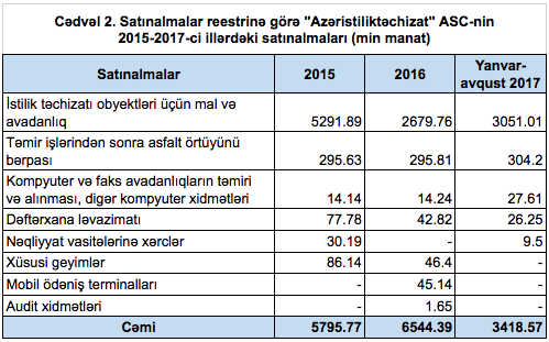 Yeri gəlmişkən, şirkətin fəaliyyəti xərclər ilə bağlı olduğuna görə, xərclərin strukturunu təhlil etmək maraqlı olardı. Təssüf ki, Hesablama Palatası yalnız istehsal və qeyri-istehsal bölgüsünü göstərib. Amma Dövlət satılnamalar reyestri vasitəsilə başqa xərclərin müəyyən hissəsini göstərmək mümkündür. Şirkət 2015-ci ildə 51, 2016-ci ildə 20 və 2017-ci ilin 8 ayında 18 tender keçirib. Keçirilən tenderlərin əsasında, biz əsas 8 istiqamət üzrə xərcləri müəyyən edə bilərik.