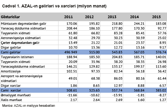 Şirkətin mənfəətinə gəldikdə isə, 2015-ci ildə şirkət məzənnə fərqindən şərti olaraq 9.5 milyon manat qazanıb. Nəticədə, illik mənfəəti 1.2 milyon manat təşkil edib. Ümumi olaraq, əvvəlki illərə nisbətdə şirkətin xalis mənfəəti 2 dəfə azalıb. Amma əvvəlki illərdə yaranan xalis mənfəət əsasən “digər gəlirlər” bölməsinin hesabına formalaşıb, 2015-ci ildə isə məzənnə fərqinə görə yaranıb. Başqa sözlə desək, təhlil apardığımız dövrdə AZAL əməliyyat mənfəəti əldə etməyib və ölkənin hava nəqliyyatı sistemində inhisarçı rola malik olan, uzun illər ərzində dövlət büdcəsindən investisiya qoyuluşu əldə edən, həmçinin aldığı beynəlxalq kreditlərinin mühüm hissəsi dövlət büdcəsi hesabına qaytarılan bir şirkətinin hansı səbəbdən hələ də əməliyyat mənfəəti əldə edə bilmədiyi suallar yaradır.