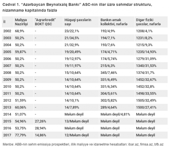 ABB maliyyə hesabatlarını və səhm buraxılışı elanlarını açıqladığı bütün zamanlarda səhmdarları adbaad deyil, hüquqi və fiziki şəxslər kimi təqdim edib. Bu səbəbdən onun kapitalına və idarəetməsinə nəzarət edən tərəflər 2017-ci ilin əvvəlinədək tam gizli qalıb.