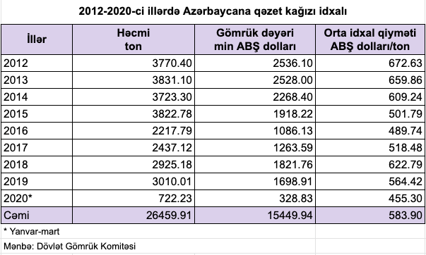 Qəzet kağızının idxal göstəricilərindən göründüyü kimi, 2012-2015-ci illərdə Azərbaycana stabil olaraq, təxminən 3800 ton qəzet kağızı gətirilib. Sonrakı illərdə qəzet kağızı idxalı müxtəlif səbəblərdən (elektron və onlayn medainın inkişafı nəticəsində çap mediasına tələbin aşağı düşməsi, devalvasiya ilə əlaqədar vətəndaşların qənaət rejiminə keçməsi, KİV-lərdə alternativ fikrin getdikcə daha çox daraldılması və informasiya mənbəyi kimi çap mediasının əhəmiyyətinin azalması və s.) kəskin şəkildə azalıb. Düzdür, 2016-cı ilki minimumdan (2217,79 ton) bu yana qəzet kağızı idxalı ilbəil artıb. Lakin 2019-cu ilin göstəricisi (3010 ton) 2015-ci ildəkindən 22% azdır.