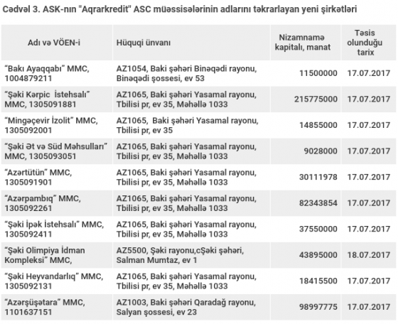 Bu şirkətlərin adları ASK-dan əldə edilib. “Açıq Azərbaycan”ın apardığı tədqiqatlar göstərir ki, əslində ABB-dən miras qalan şirkətlərin idarə olunması məqsədilə yaradılan şirkətlər daha çoxdur. Vergilər Nazirliyinin tərtib etdiyi reyestrdə onların bir neçəsini tapmaq olar. Bu şirkətlər ABB-nin problemli aktivləri “Aqrarkredit” QSC-yə ötürüləndən sonra yaradılıb. Və adlarından göründüyü kimi, ASK ASC-nin yaratdığı şirkətlər əvvəlkiləri təkrarlayır.