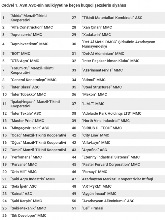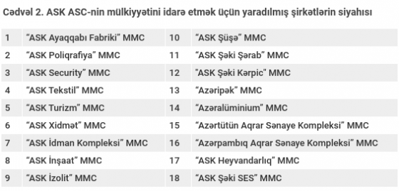 “Açıq Azərbaycan” ASK-nın balansına keçmiş kommersiya qurumlarının və onları idarə etməkdən ötrü yaradılmış şirkətlərin siyahısını əldə edib. Məlum olub ki, ASK-nın idarəetməsində 51 şirkət var, ancaq korporasiya onların çoxunun indiki durumu haqda məlumat vermir.