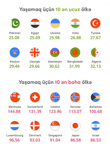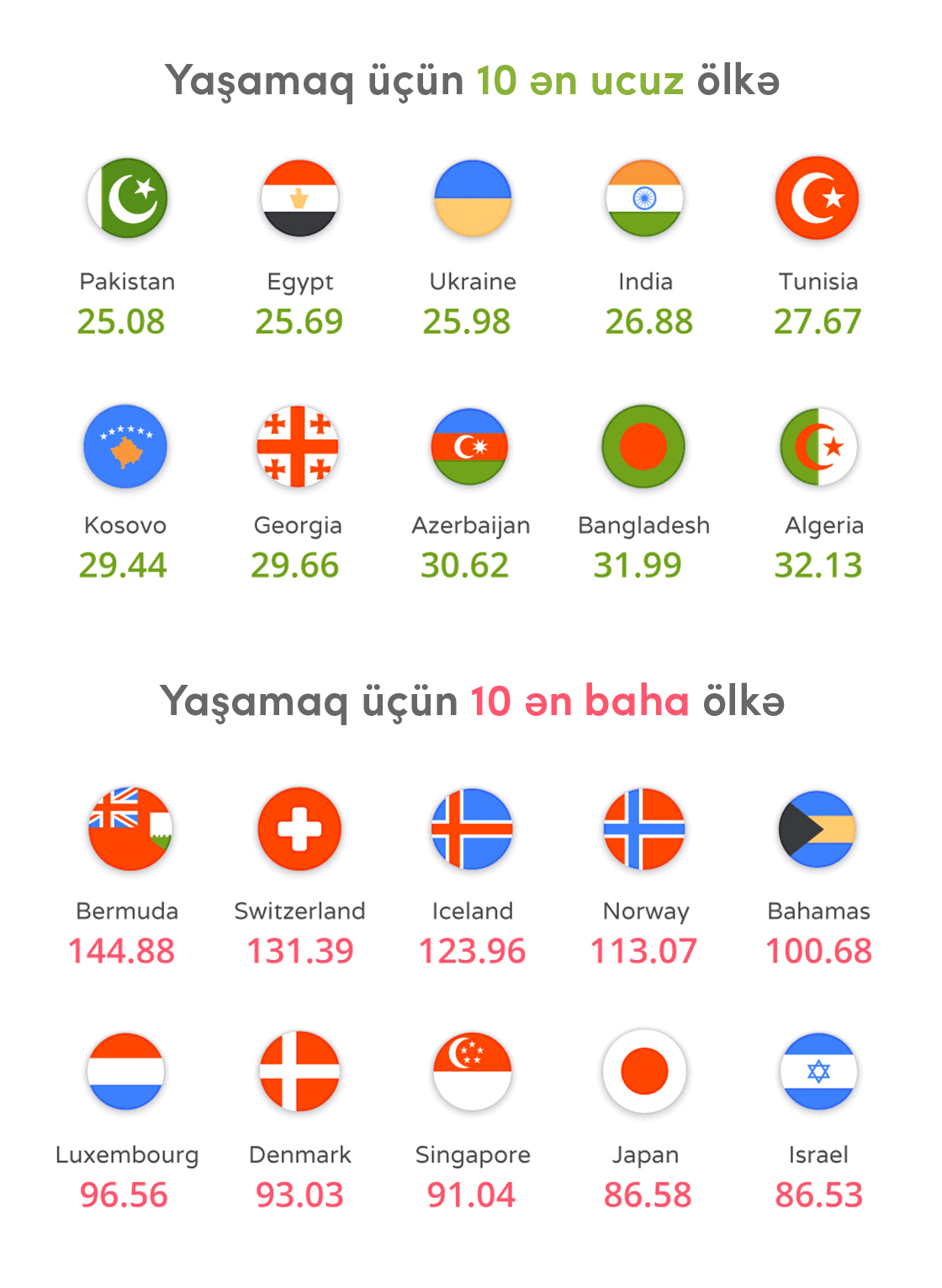 İndeksə görə dünyanın ən bahalı 10 ölkəsi bunlardır: Bermud adaları, İsveçrə, İslandiya, Norveç, Baham adaları, Luksemburq, Danimarka, Sinqapur, Yaponiya, İsrail.Həmçinin dünyanın ən ucuz 10 ölkəsi isə belə sıralanır: Pakistan, Misir, Ukrayna, Hindistan, Tunis, Suriya, Kosovo, Gürcüstan, Azərbaycan, Banqladeş.